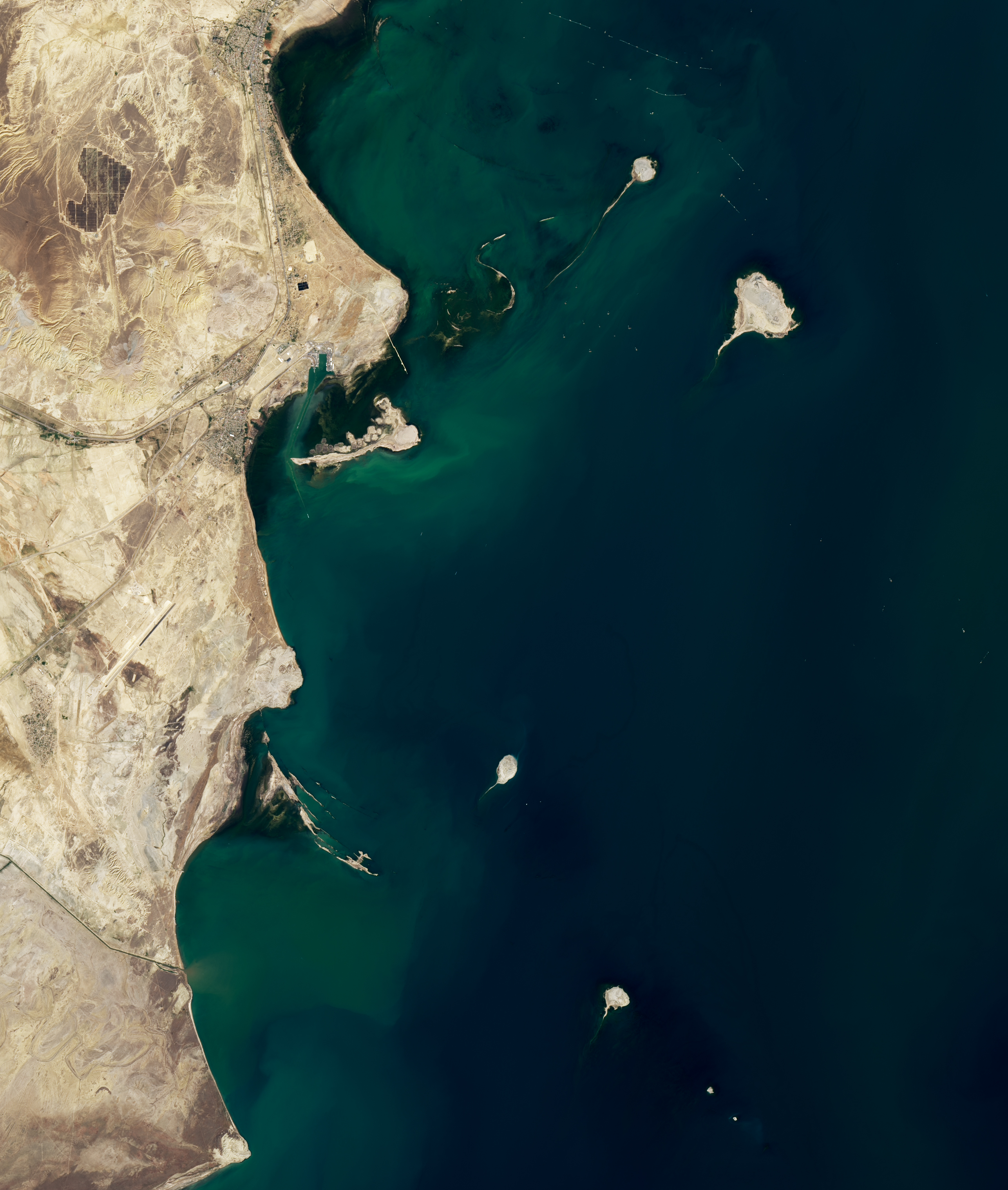 Four tadpole-shaped mud volcano islands are visible along the Caspian Sea in this image captured on August 30, 2025, by the OLI (Operational Land Imager) on Landsat 8.