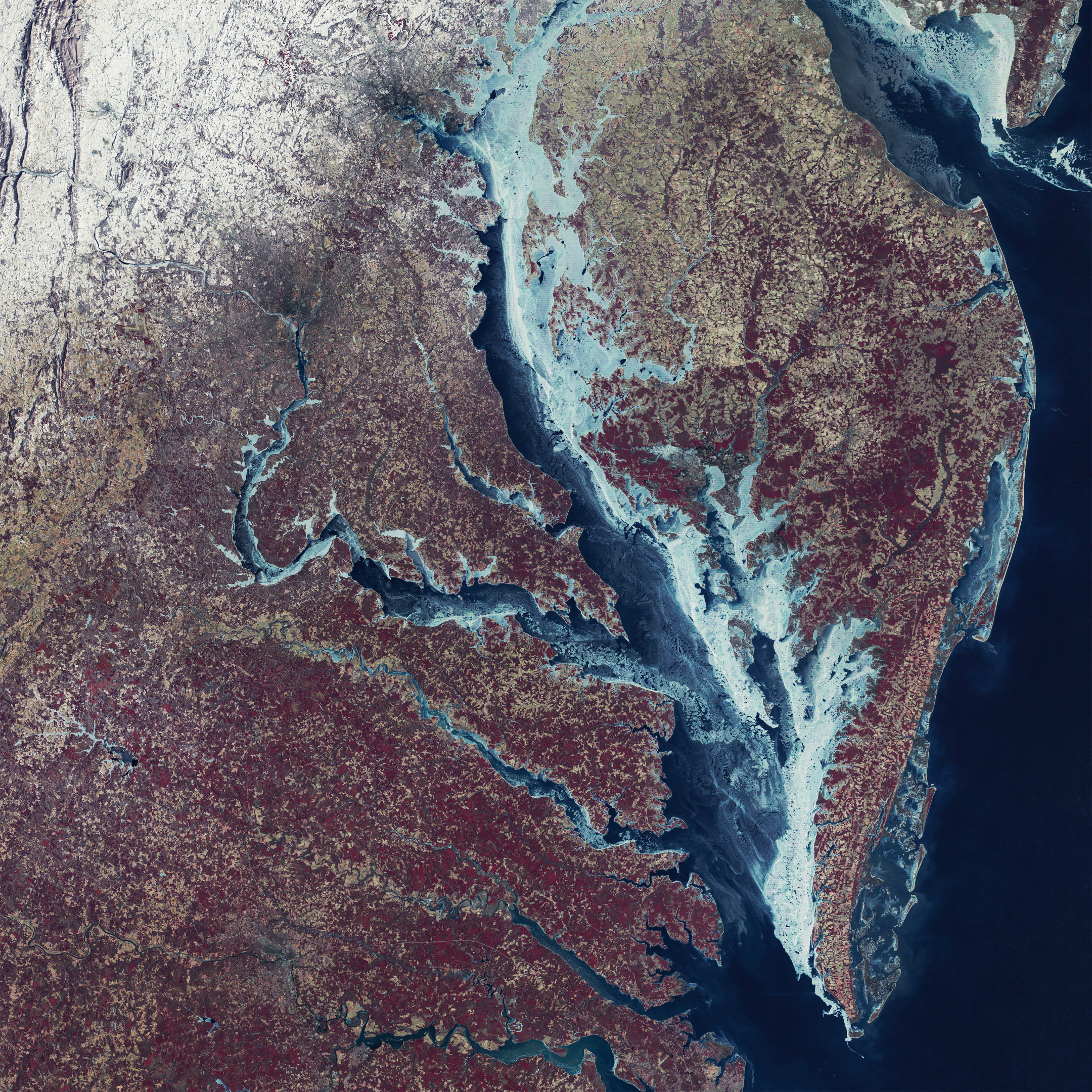 A NASA analysis published in 1980 drew on these and other Landsat images to examine the anomalous ice conditions. Images indicate that ice began forming in the Chesapeake Bay’s upper tributaries in late December 1976 and spread to the middle of the upper bay by mid-January 1977. It reached its maximum extent around the time of this image, one week into February, when ice spanned 85 percent of the bay.